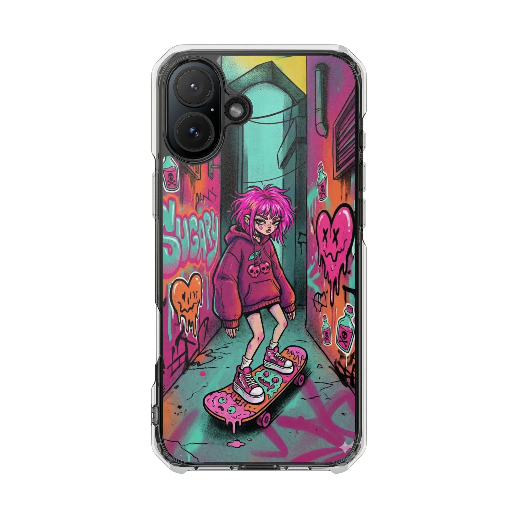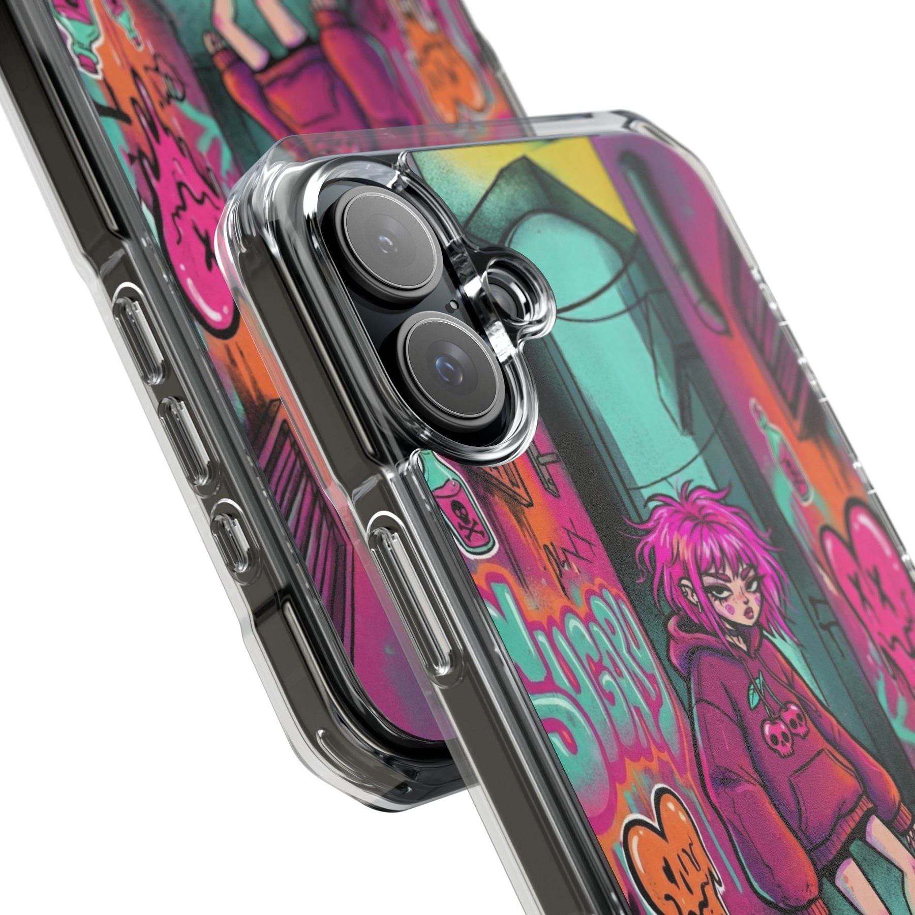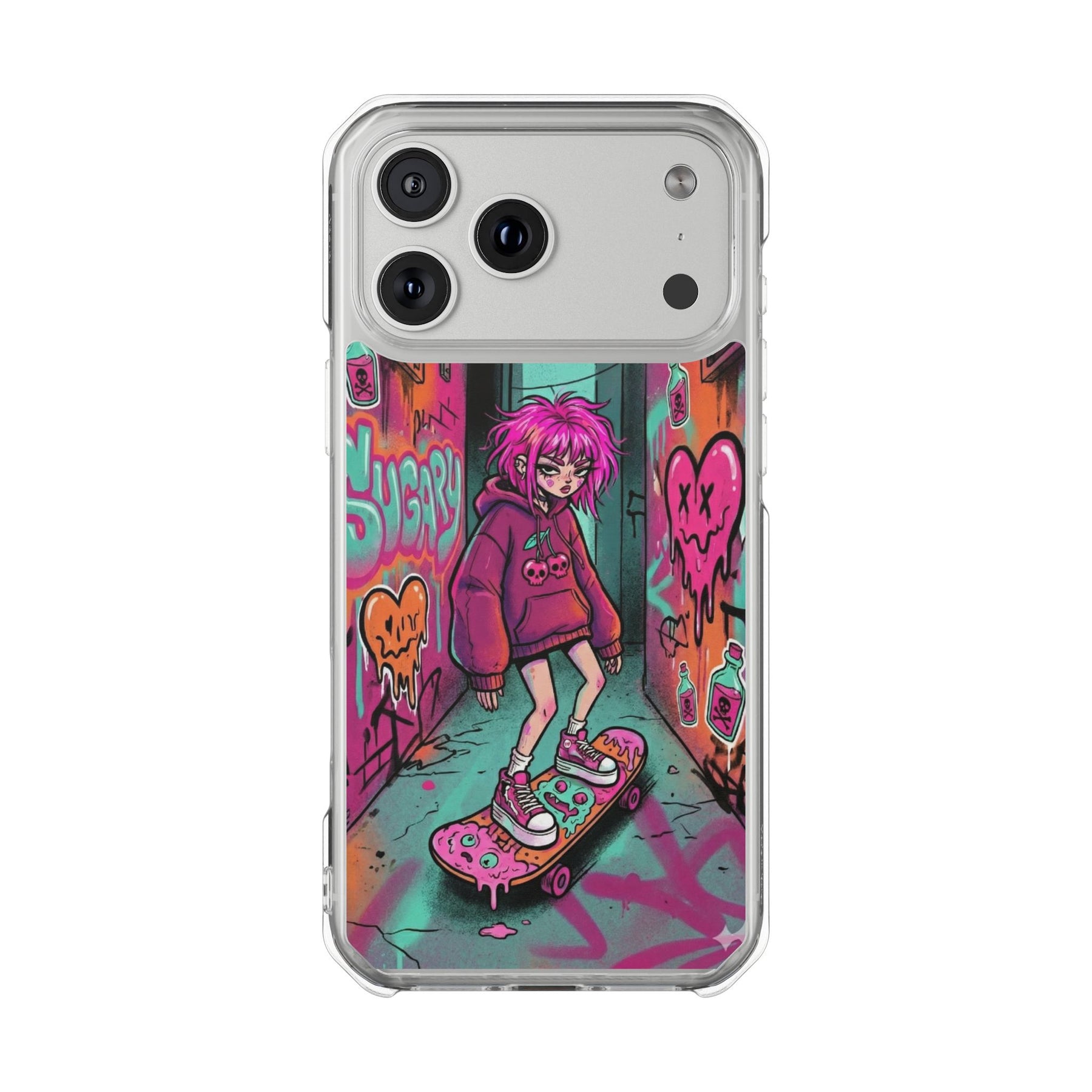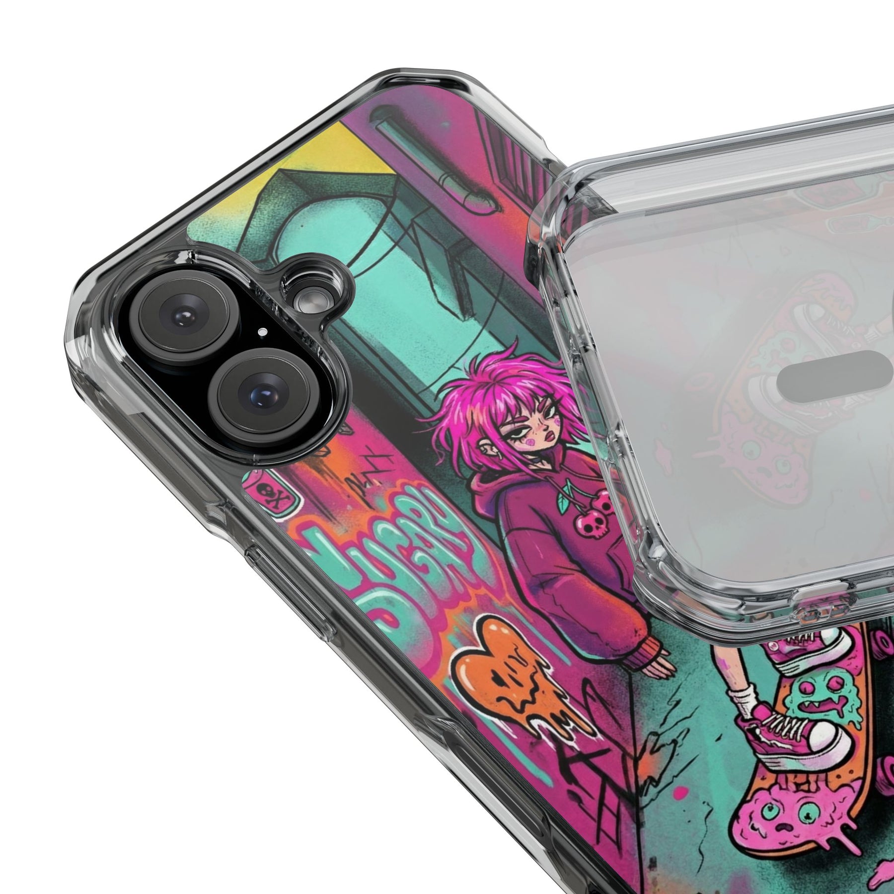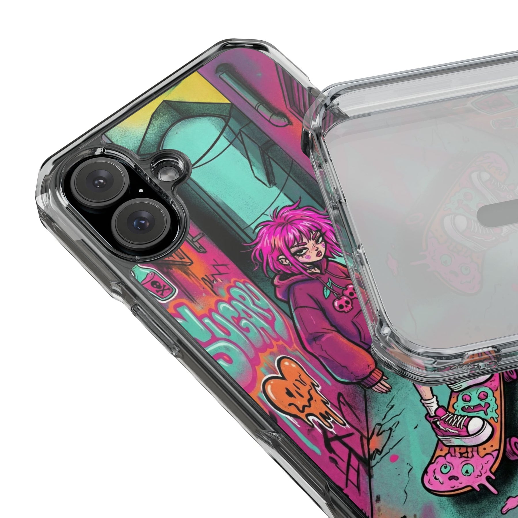 ネオンが滲む路地裏に、反骨のスケーターガール。カラフルなグラフィティと毒っぽい可愛さが、透明ケース越しに“あなたのスマホ”と一体化します。クリアシェルだから本体カラーを隠さず、アートの一部として映えるのが魅力。
