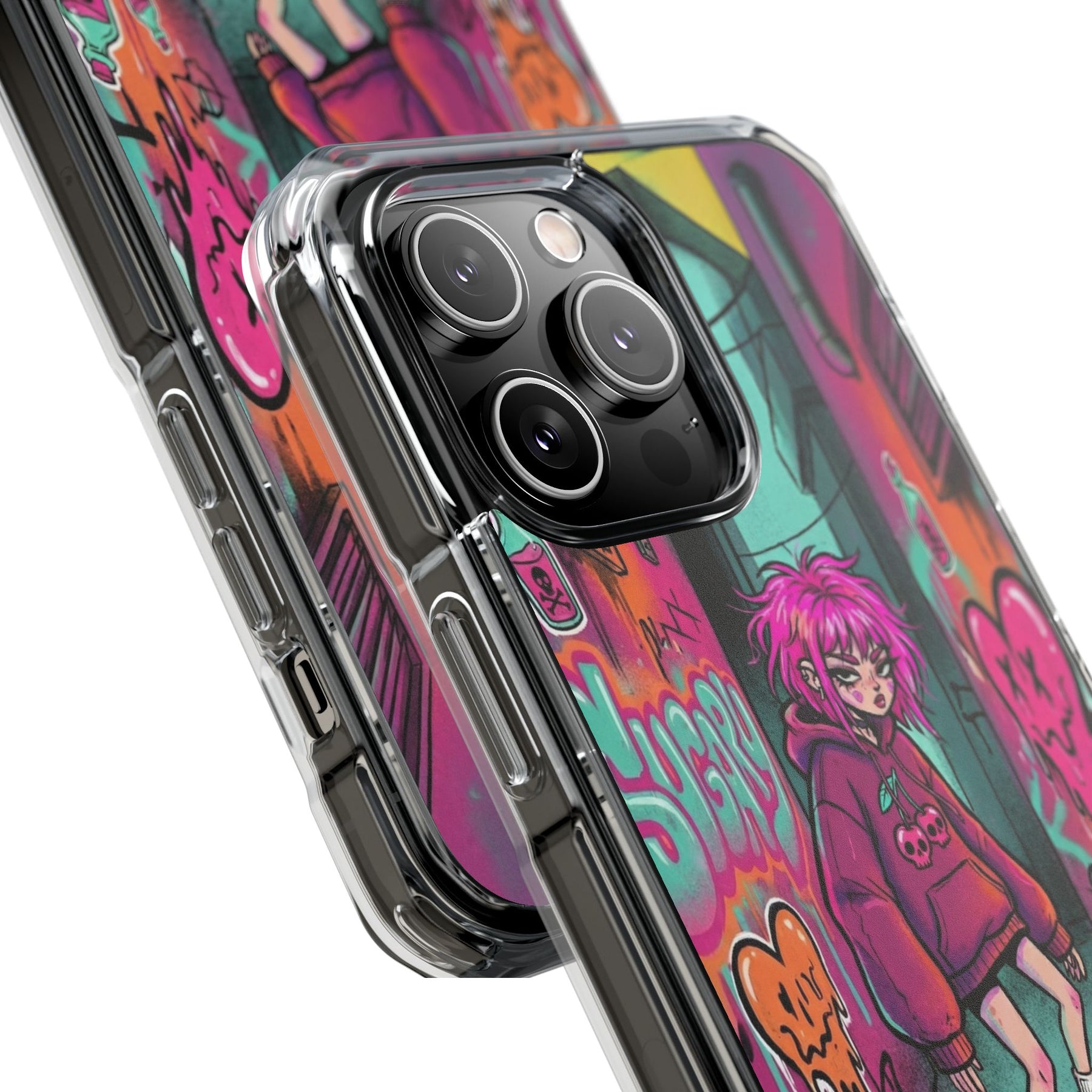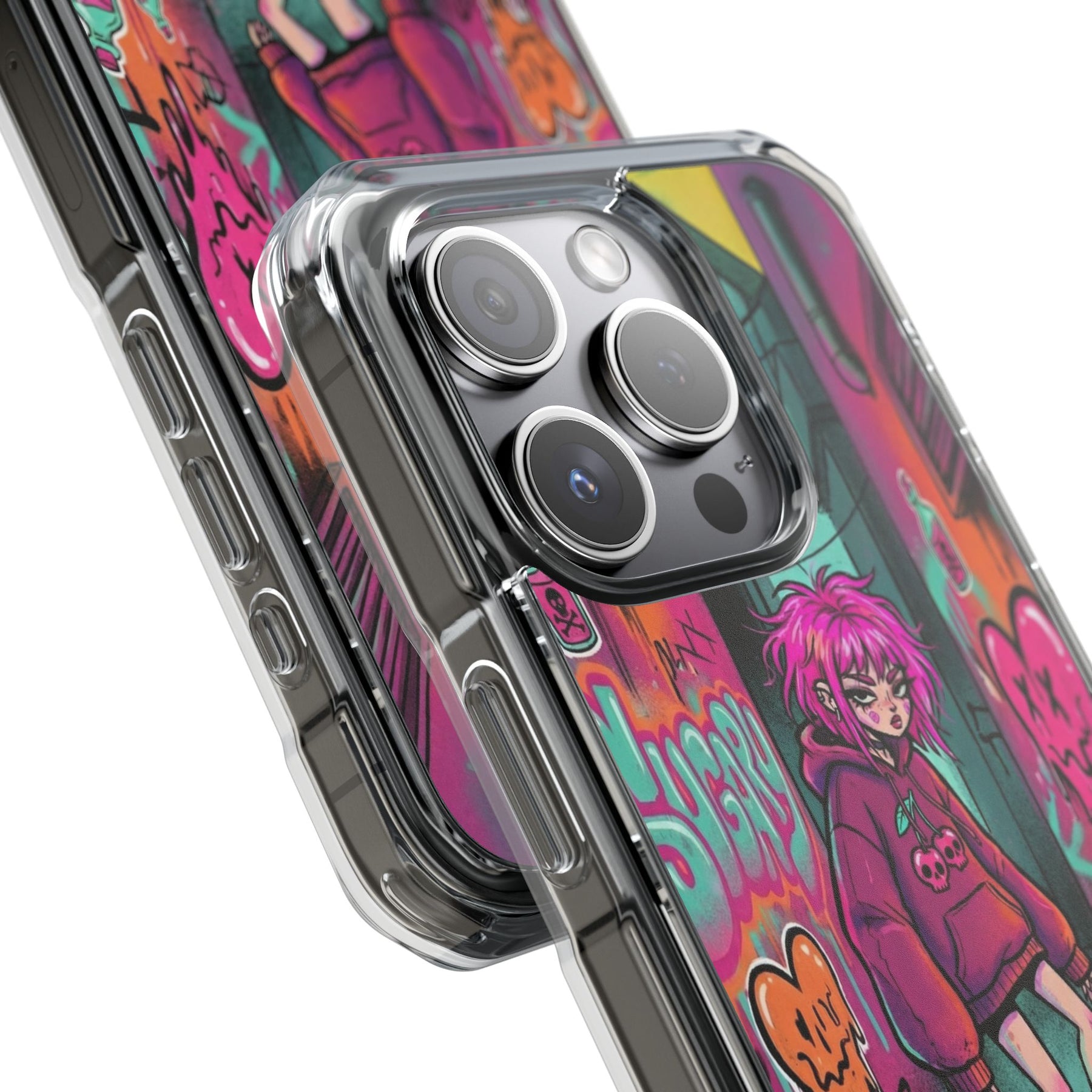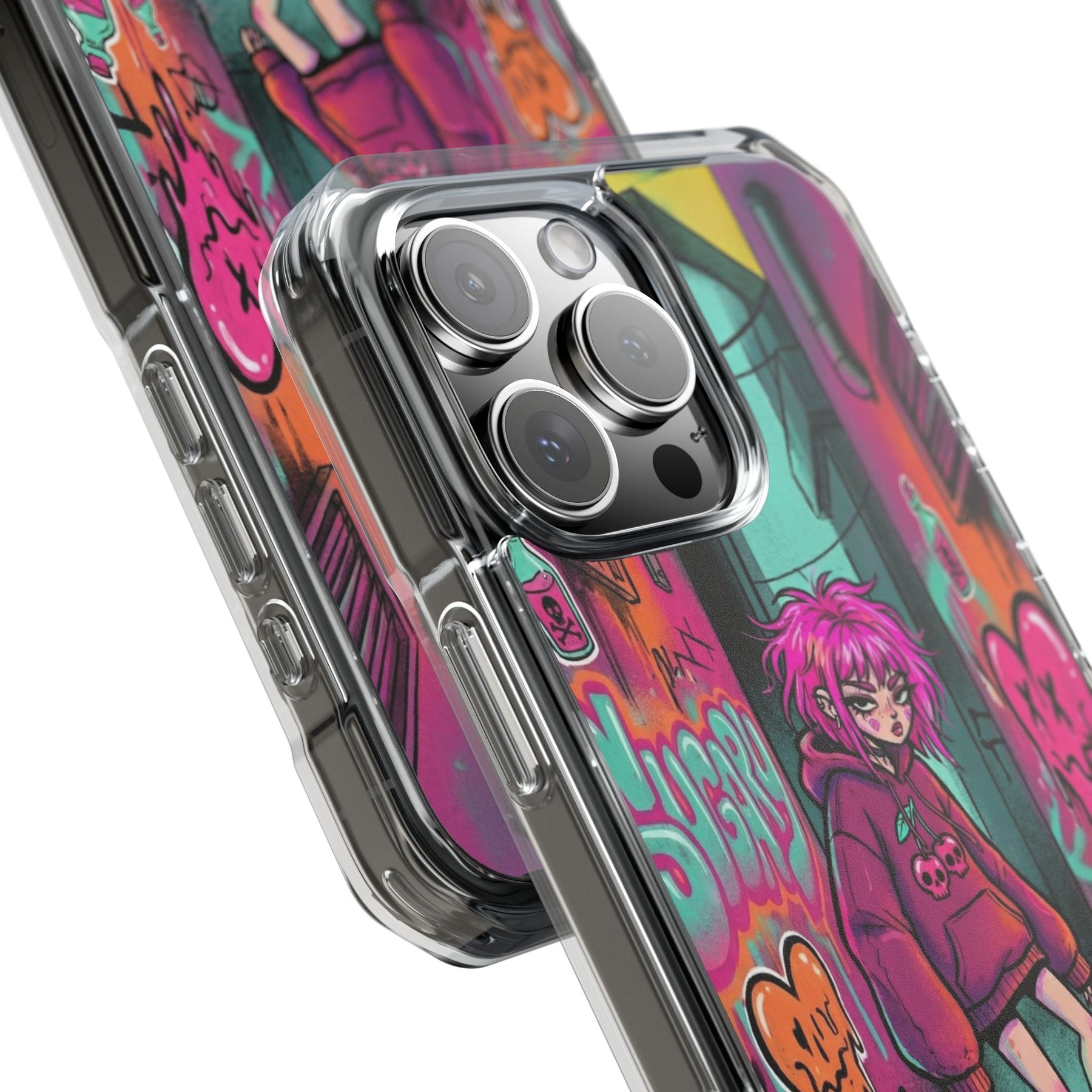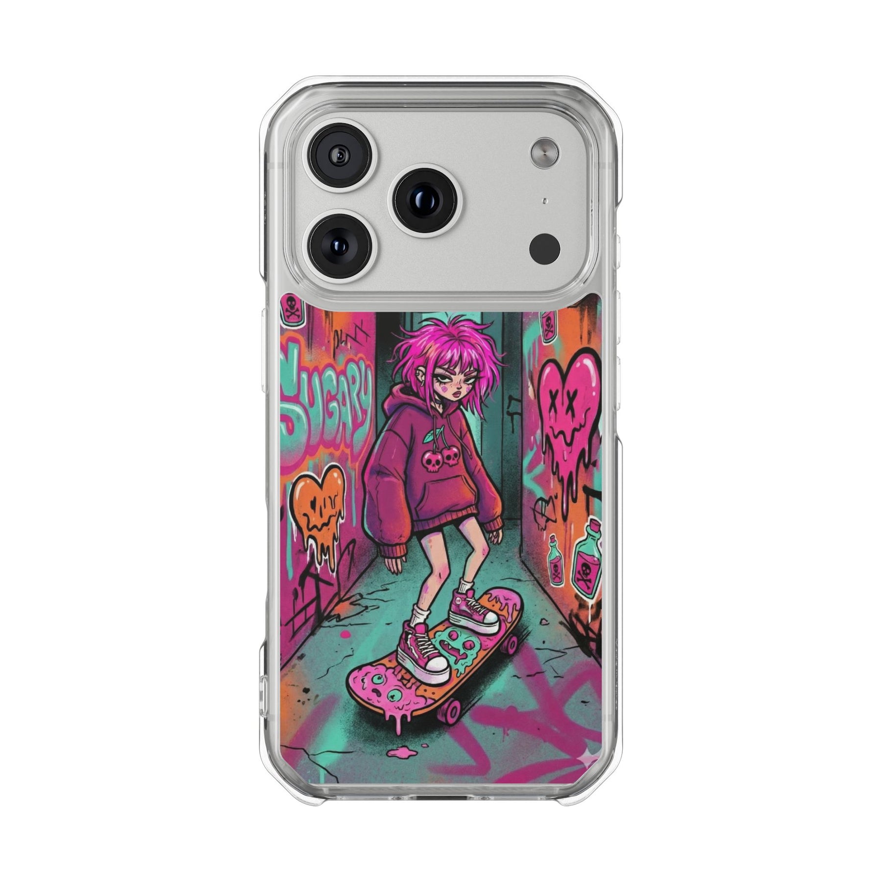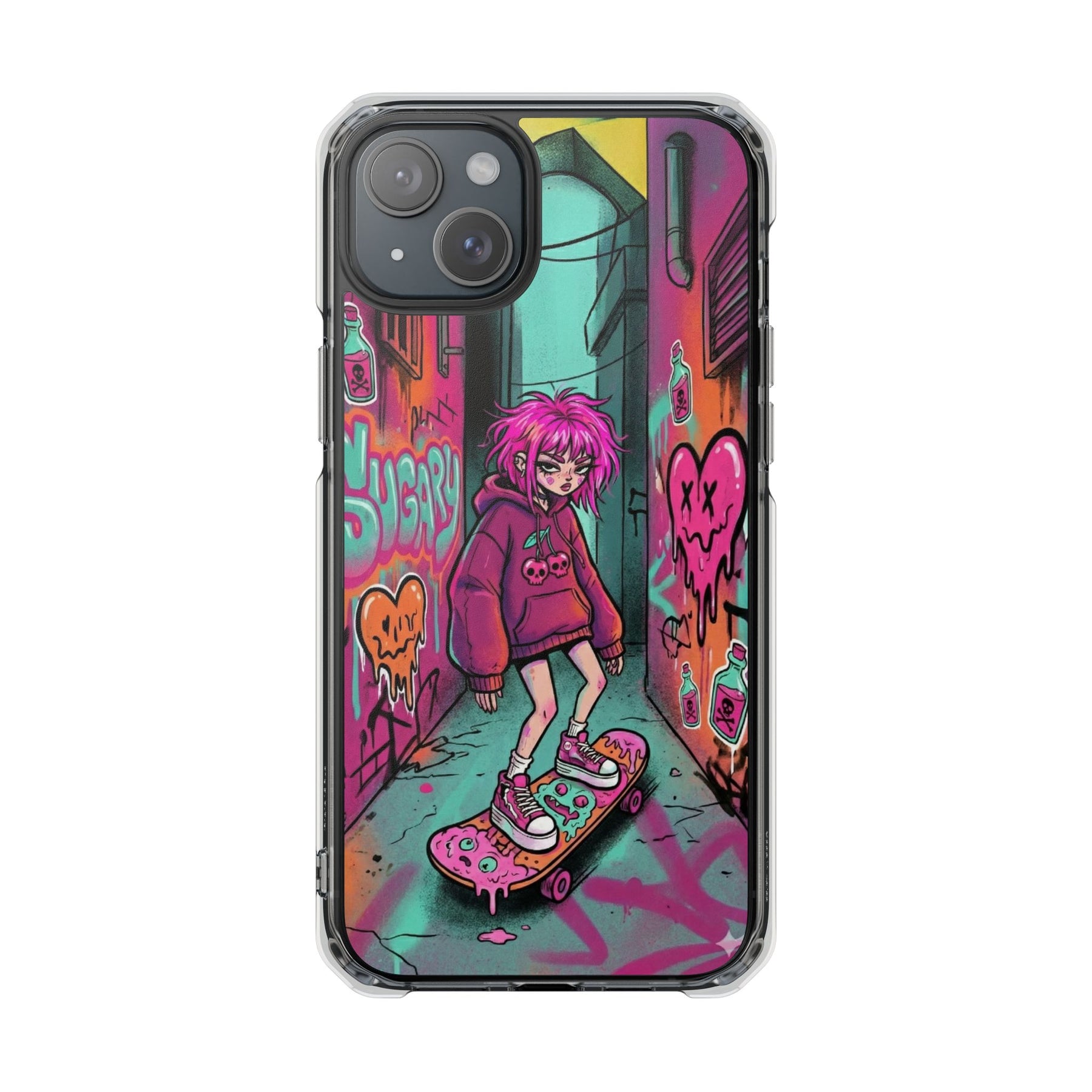 ネオンが滲む路地裏に、反骨のスケーターガール。カラフルなグラフィティと毒っぽい可愛さが、透明ケース越しに“あなたのスマホ”と一体化します。クリアシェルだから本体カラーを隠さず、アートの一部として映えるのが魅力。