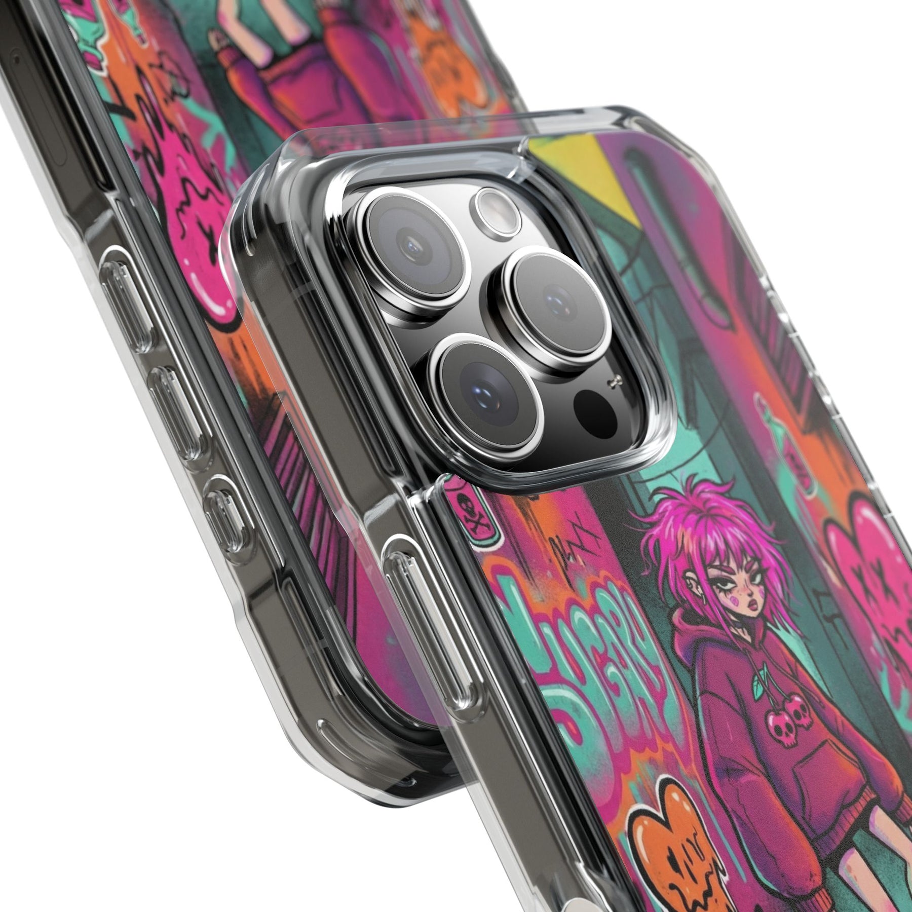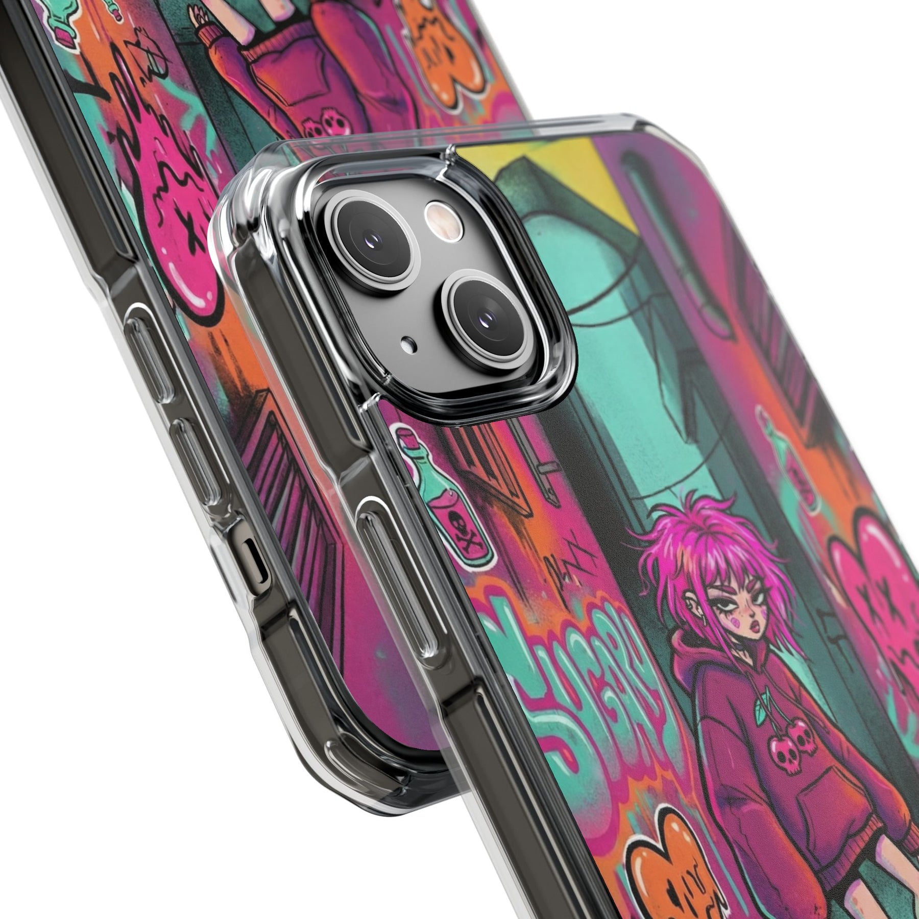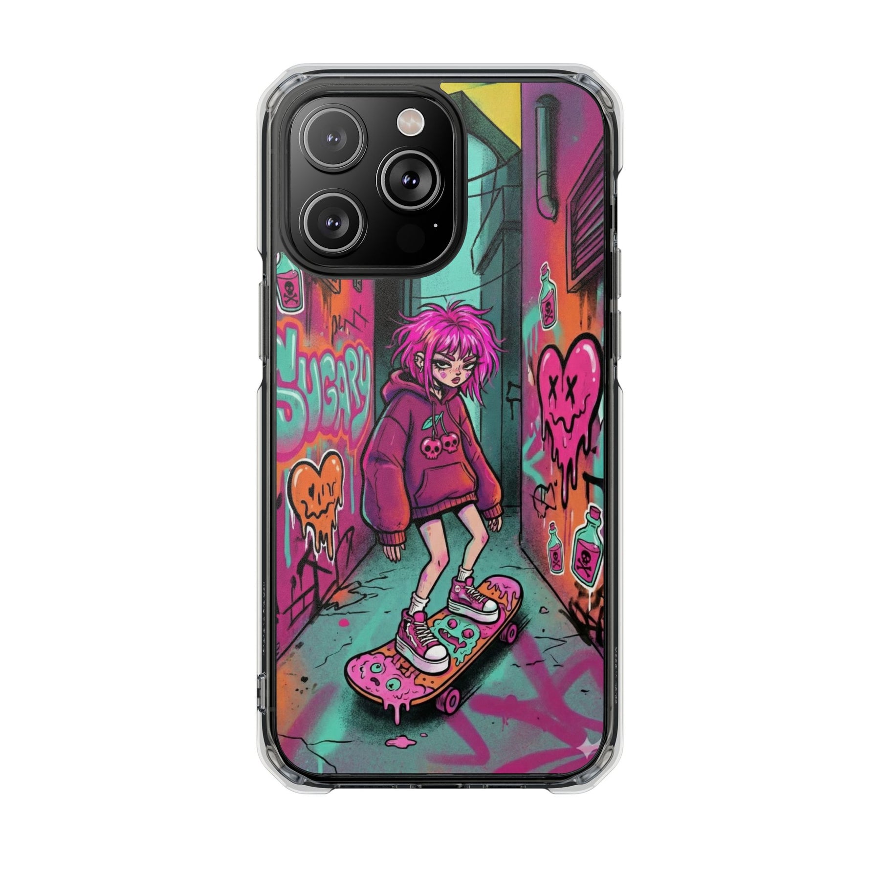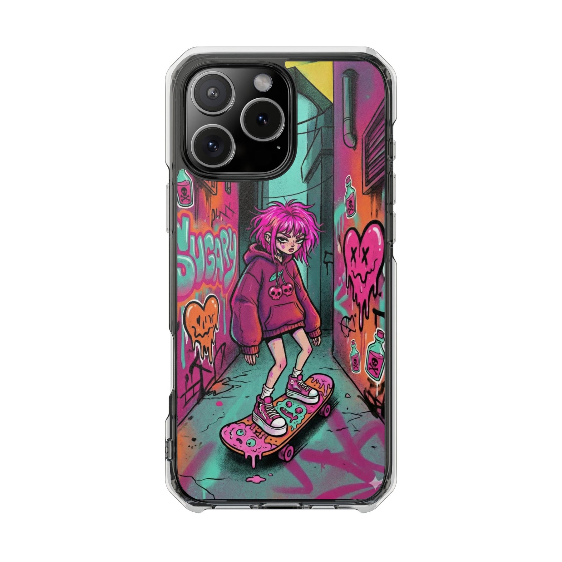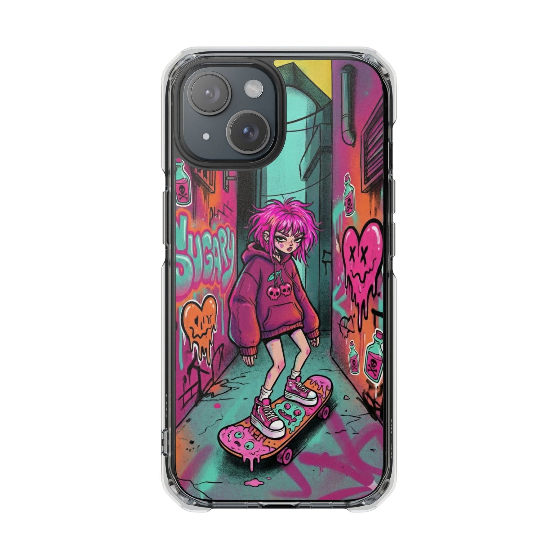 ネオンが滲む路地裏に、反骨のスケーターガール。カラフルなグラフィティと毒っぽい可愛さが、透明ケース越しに“あなたのスマホ”と一体化します。クリアシェルだから本体カラーを隠さず、アートの一部として映えるのが魅力。