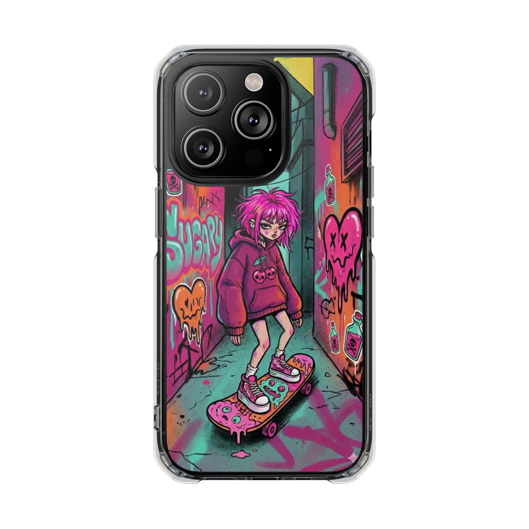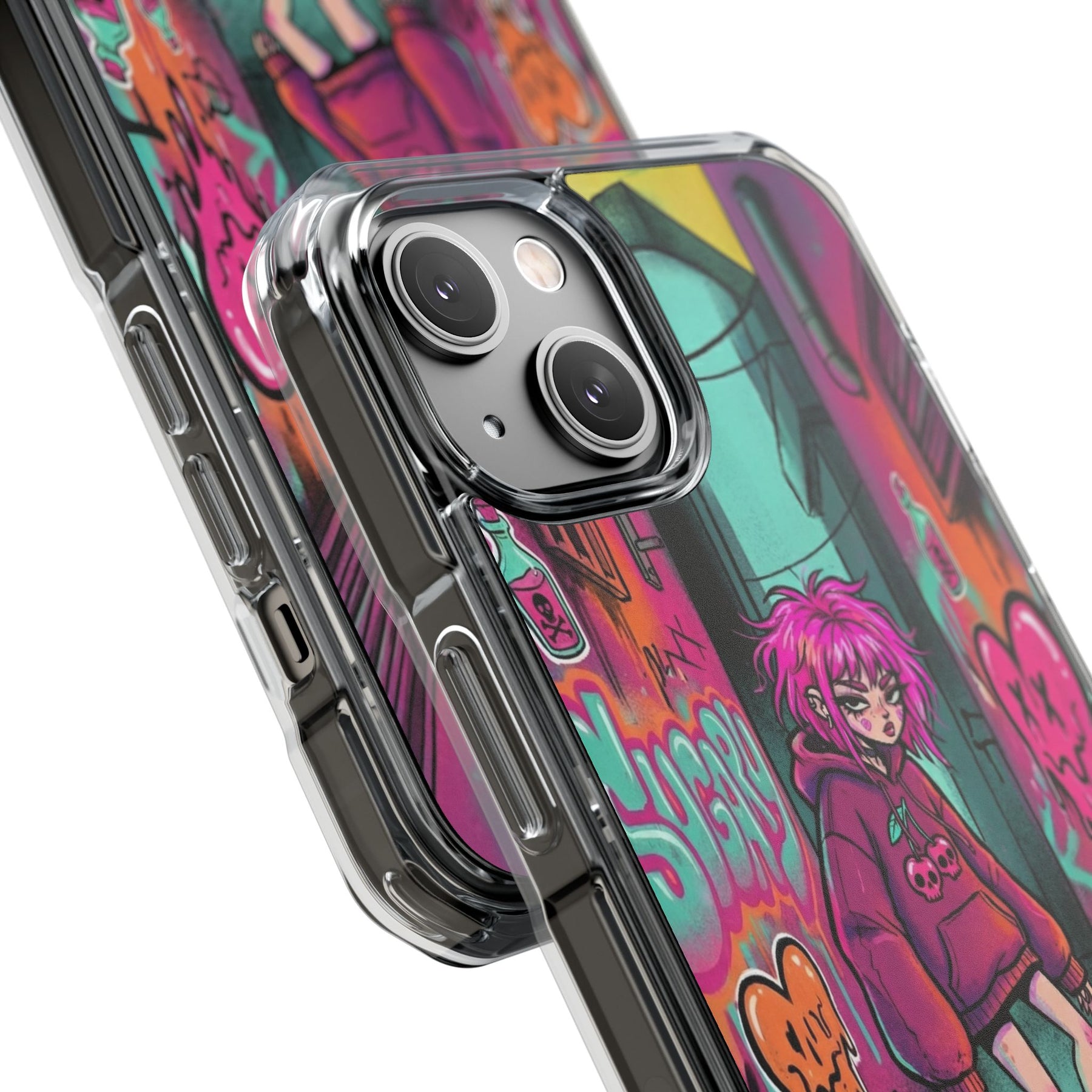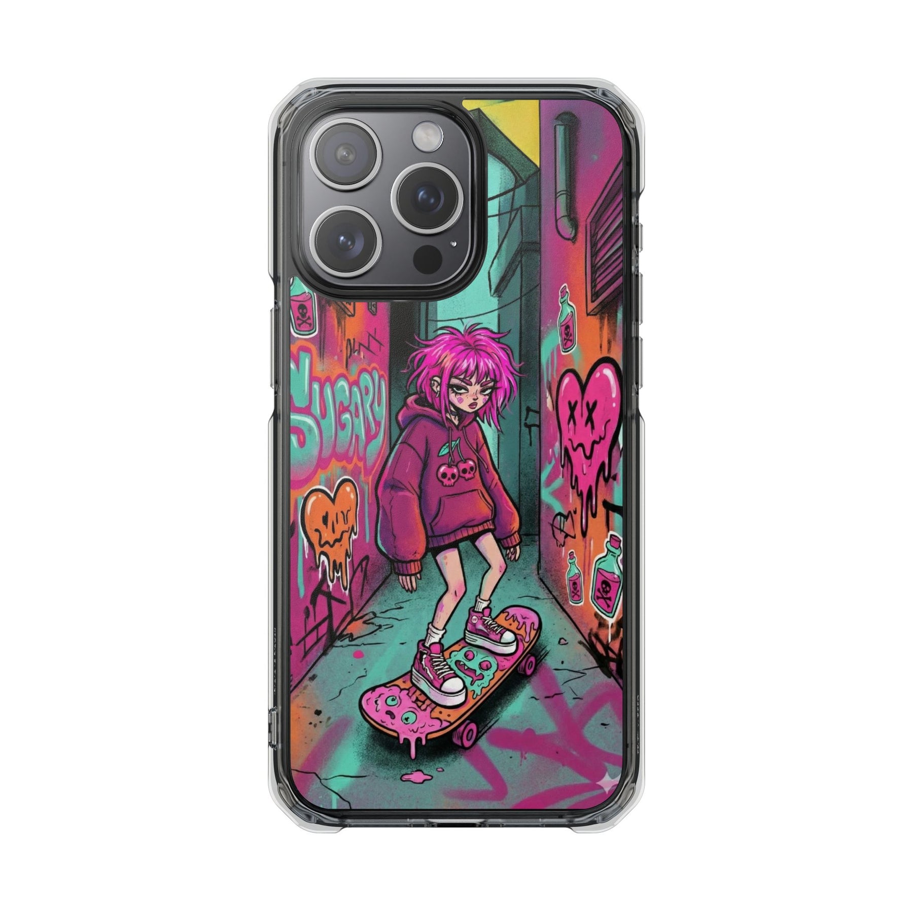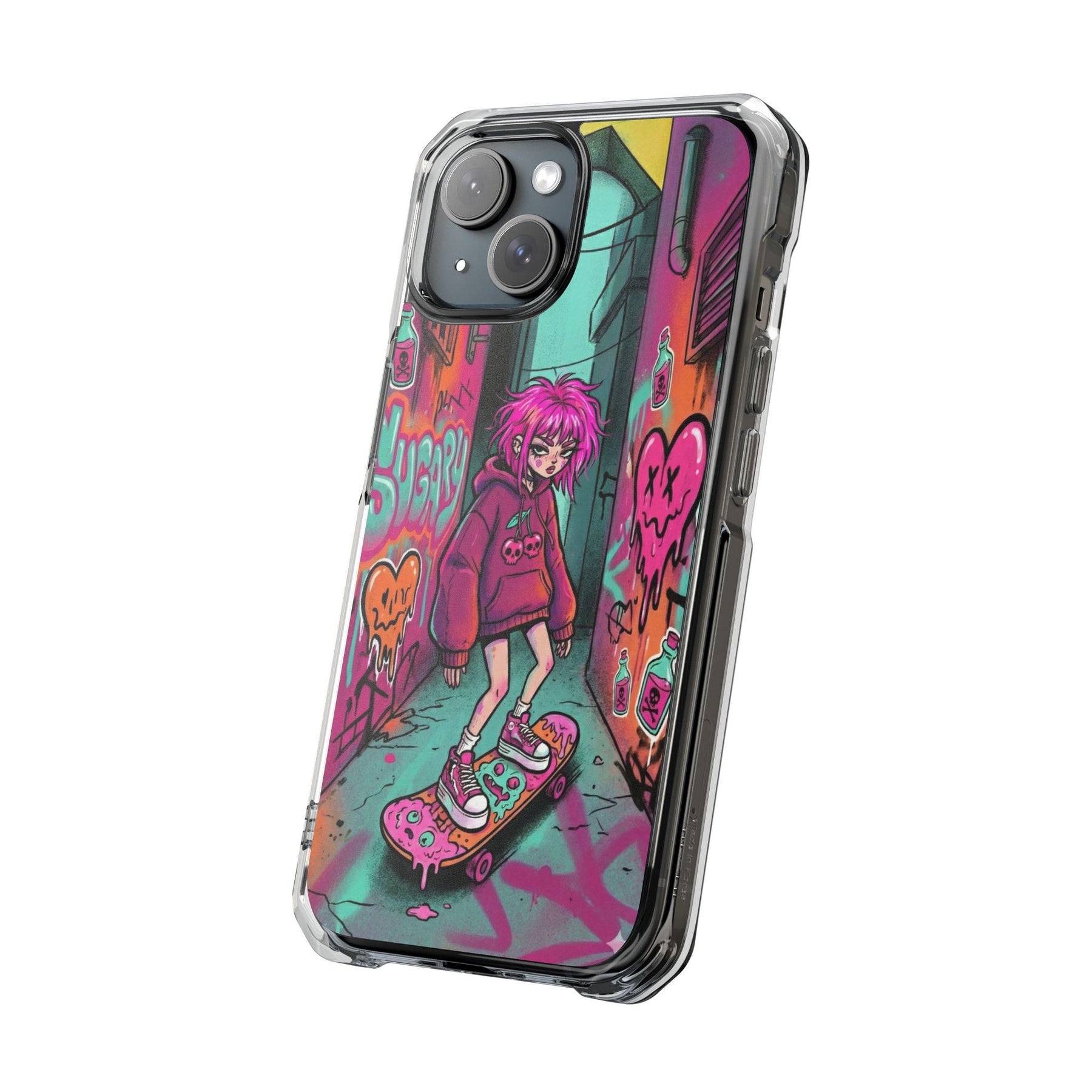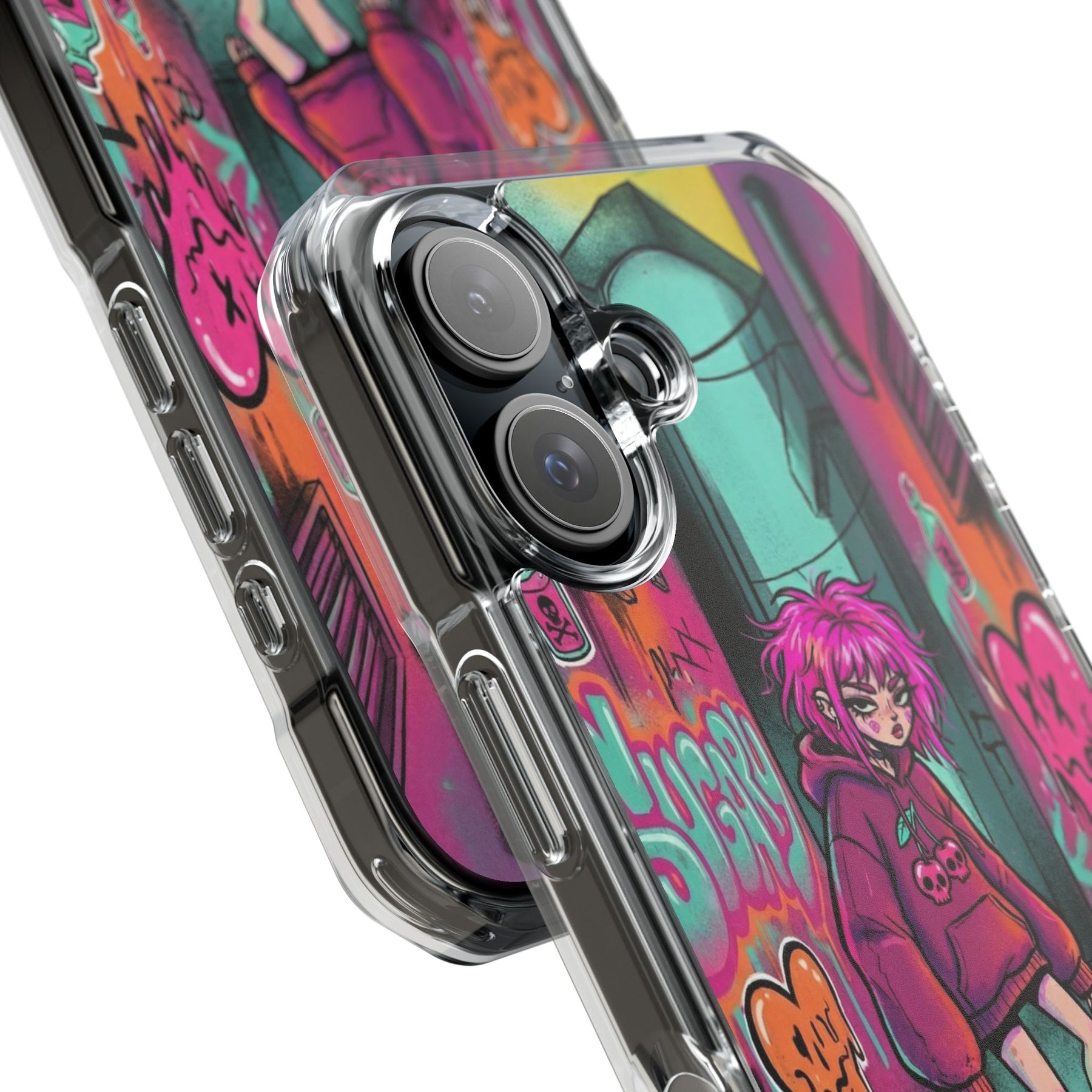 ネオンが滲む路地裏に、反骨のスケーターガール。カラフルなグラフィティと毒っぽい可愛さが、透明ケース越しに“あなたのスマホ”と一体化します。クリアシェルだから本体カラーを隠さず、アートの一部として映えるのが魅力。