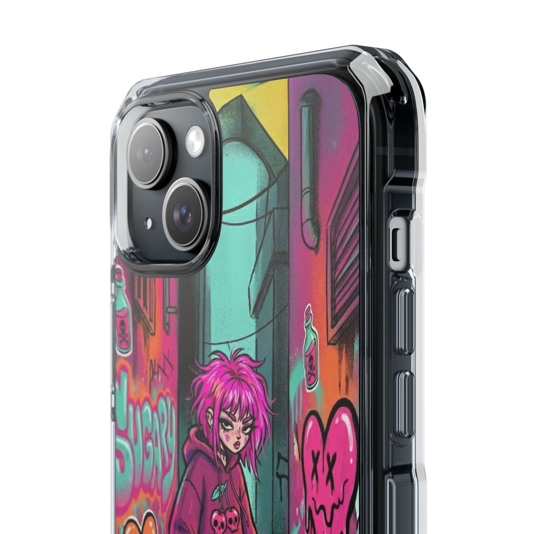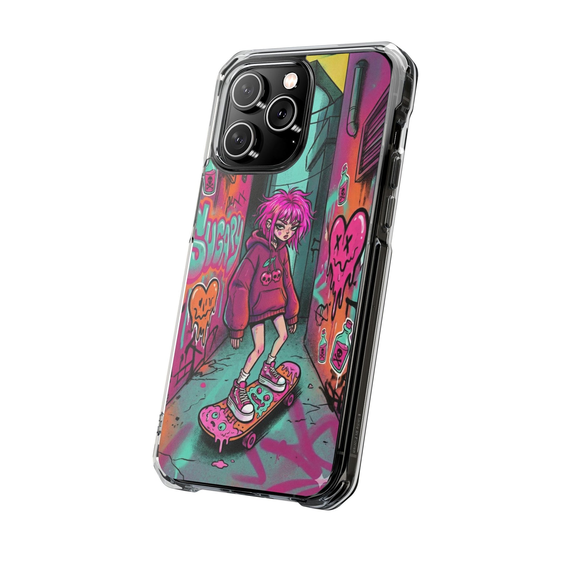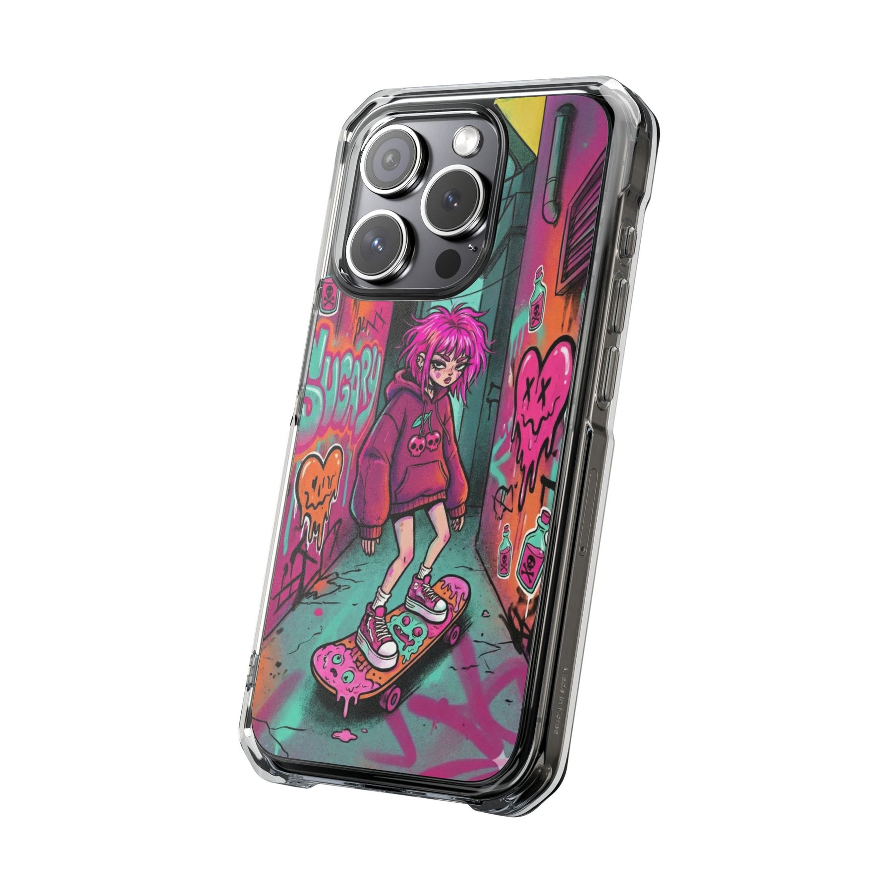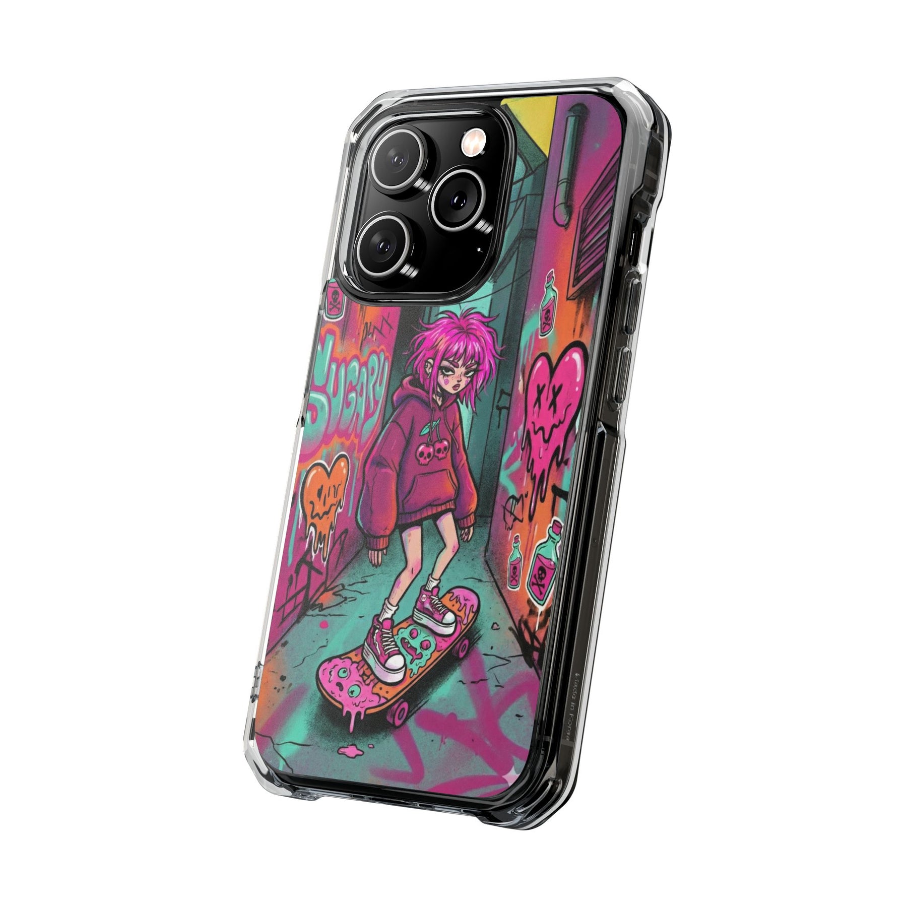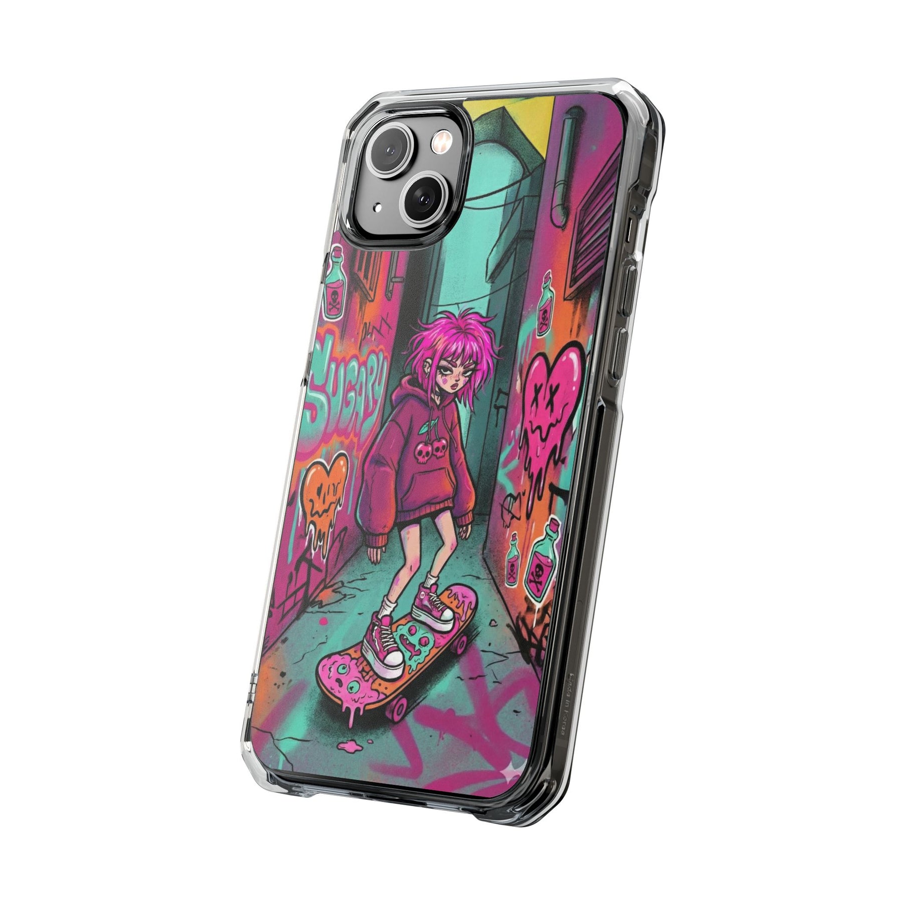 ネオンが滲む路地裏に、反骨のスケーターガール。カラフルなグラフィティと毒っぽい可愛さが、透明ケース越しに“あなたのスマホ”と一体化します。クリアシェルだから本体カラーを隠さず、アートの一部として映えるのが魅力。