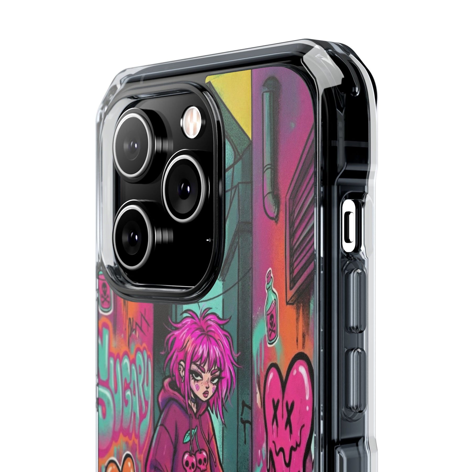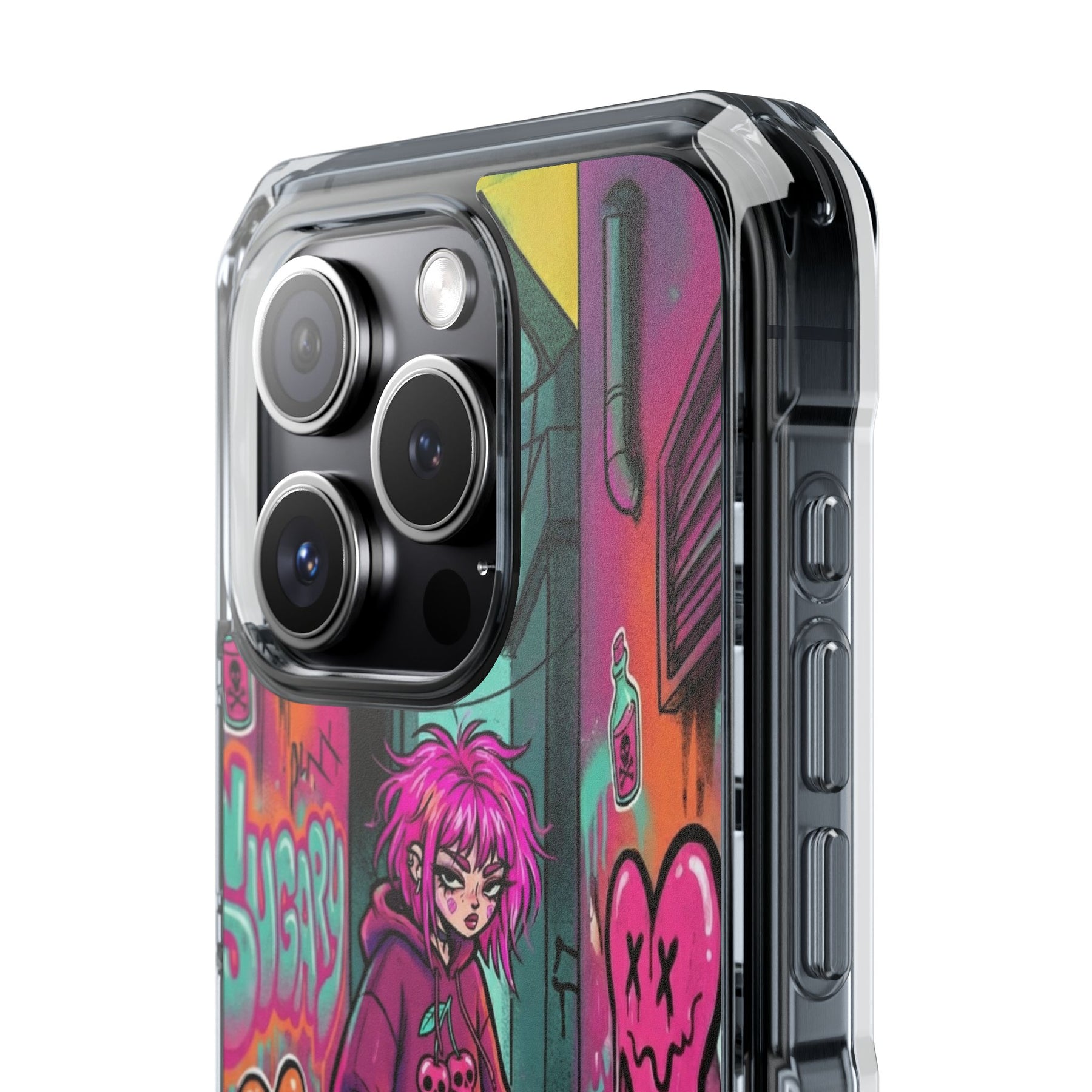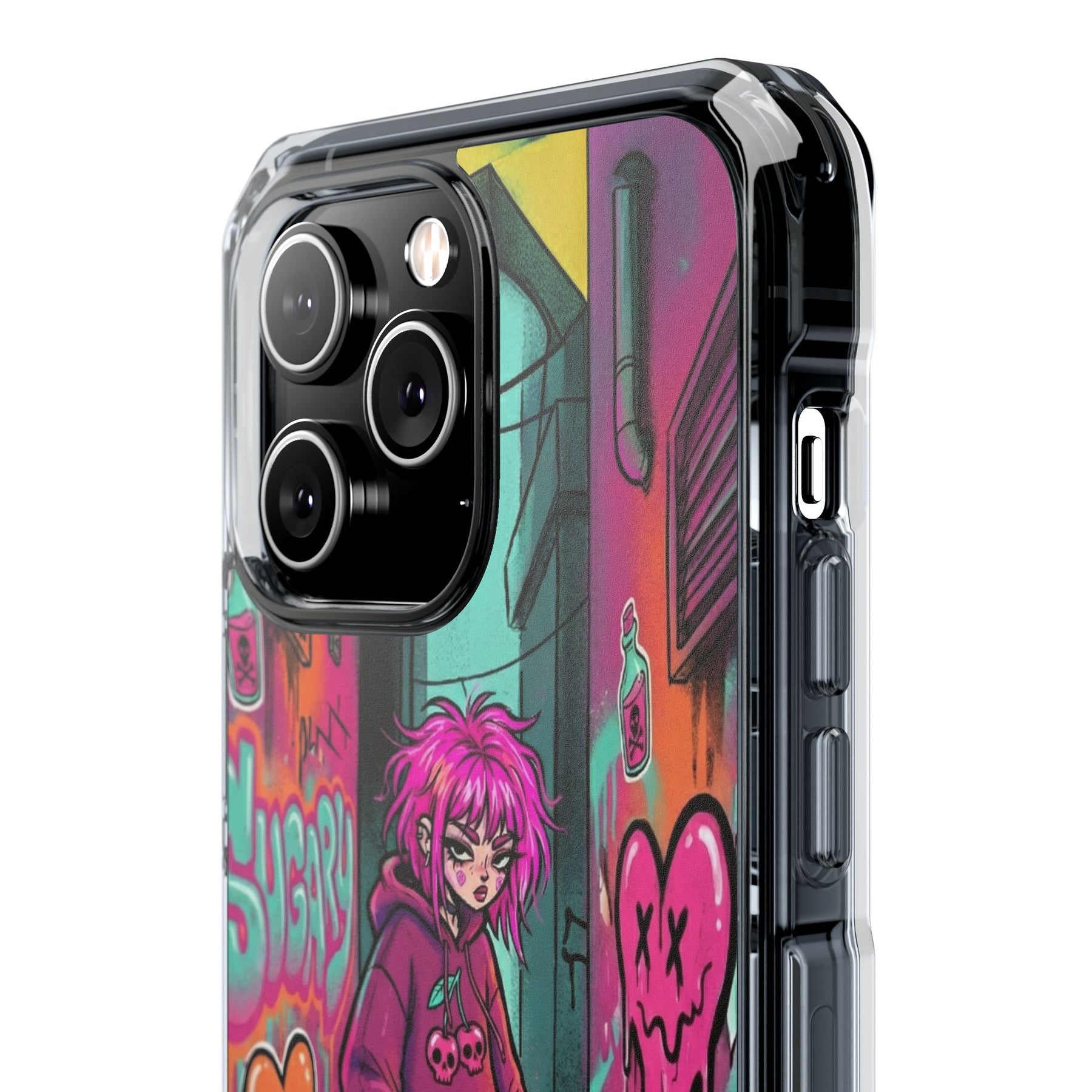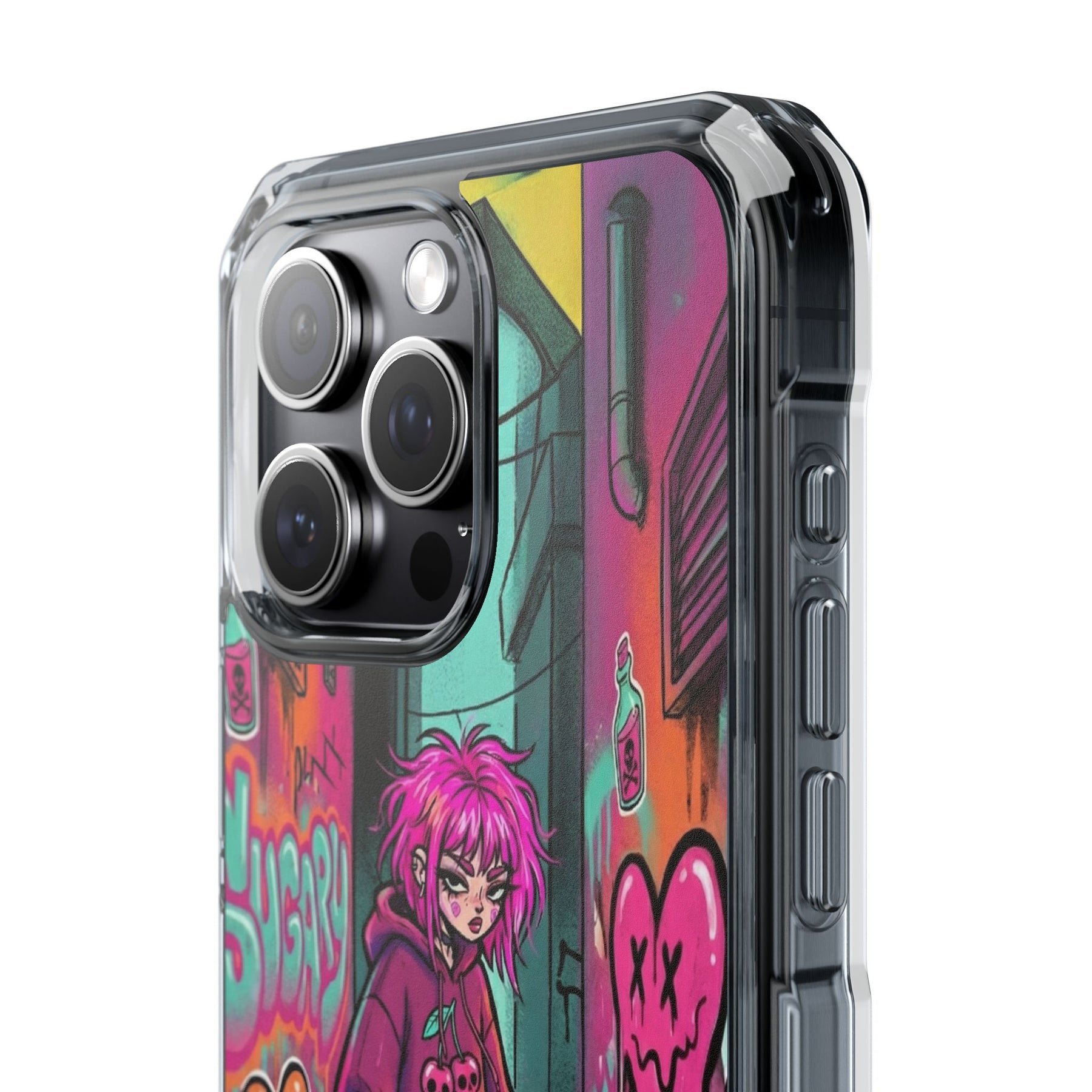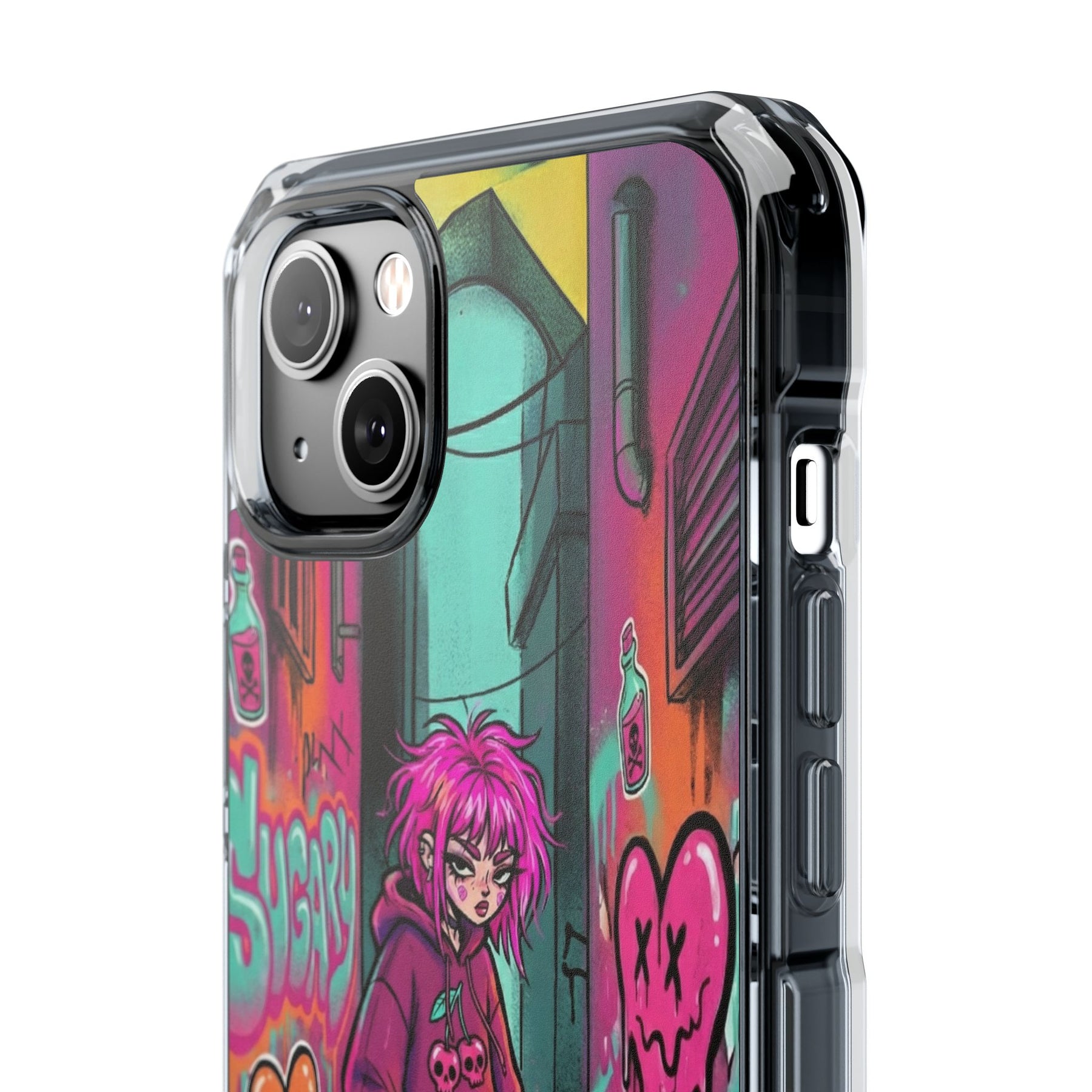 ネオンが滲む路地裏に、反骨のスケーターガール。カラフルなグラフィティと毒っぽい可愛さが、透明ケース越しに“あなたのスマホ”と一体化します。クリアシェルだから本体カラーを隠さず、アートの一部として映えるのが魅力。