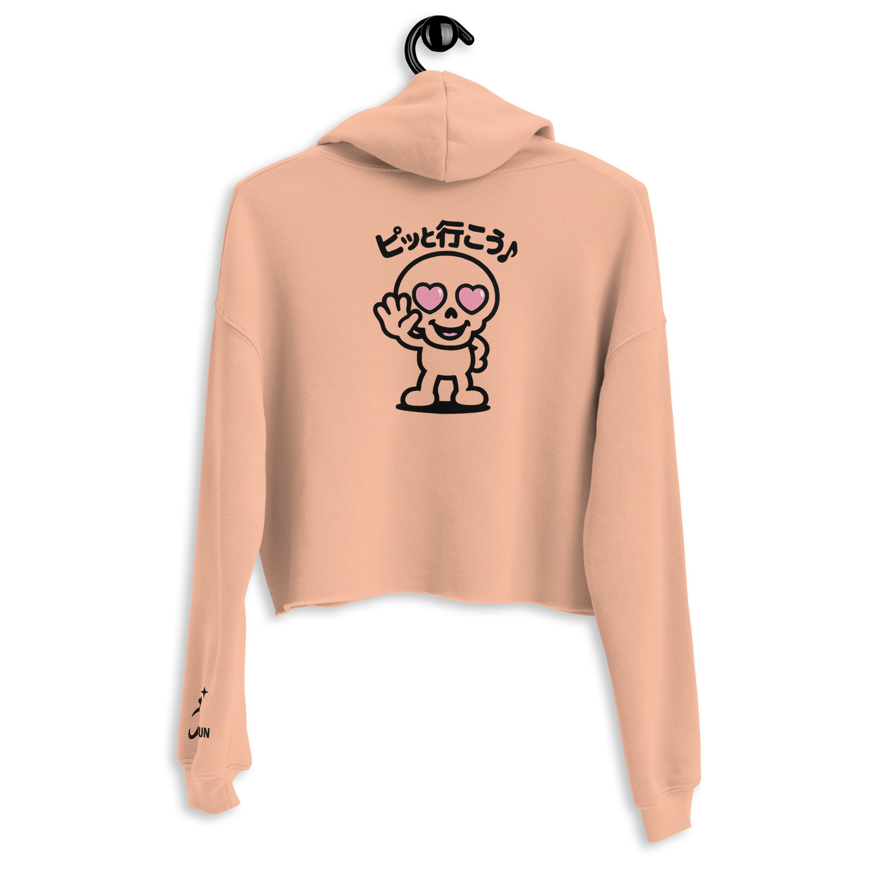 ハート目スカル「HEARTON(ハートン)」をセンターに、袖にはJUNロゴ、背面にはボディ付きハートン&「ピッと行こう♪」。可愛さと反骨スピリットを両立した、JUNらしいステートメント・クロップフーディです。トレンドのドロップショルダー × クロップ丈 × ローヘムで、ハイウエストのデニムやスカートとも相性抜群。羽織るだけでコーデが“今っぽく”キマります。