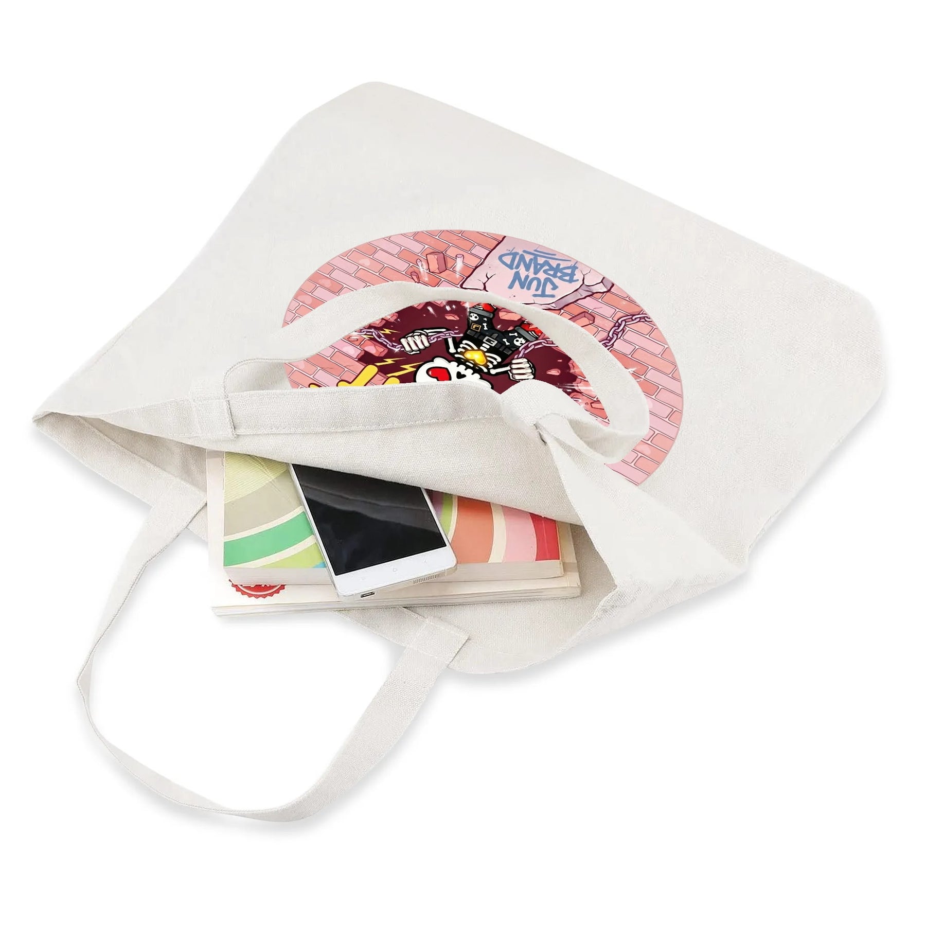 ストリート感あるレンガウォール×スカルアートが、毎日のコーデにインパクトをプラスするJUN BRANDのトートバッグです。シンプルなコットン素材だから、どんなスタイルにも合わせやすく、サブバッグとしてもメインとしても活躍します。