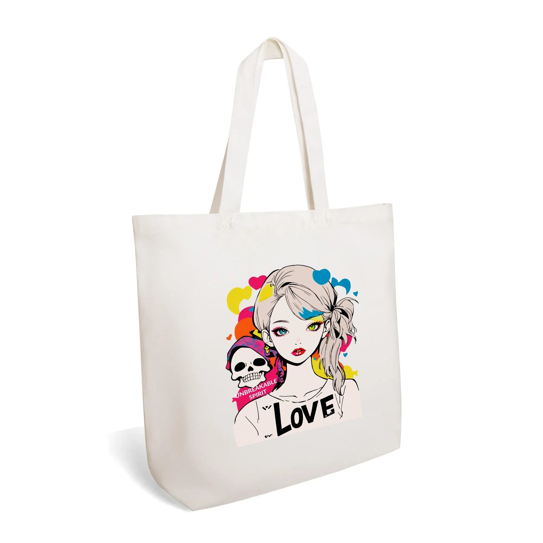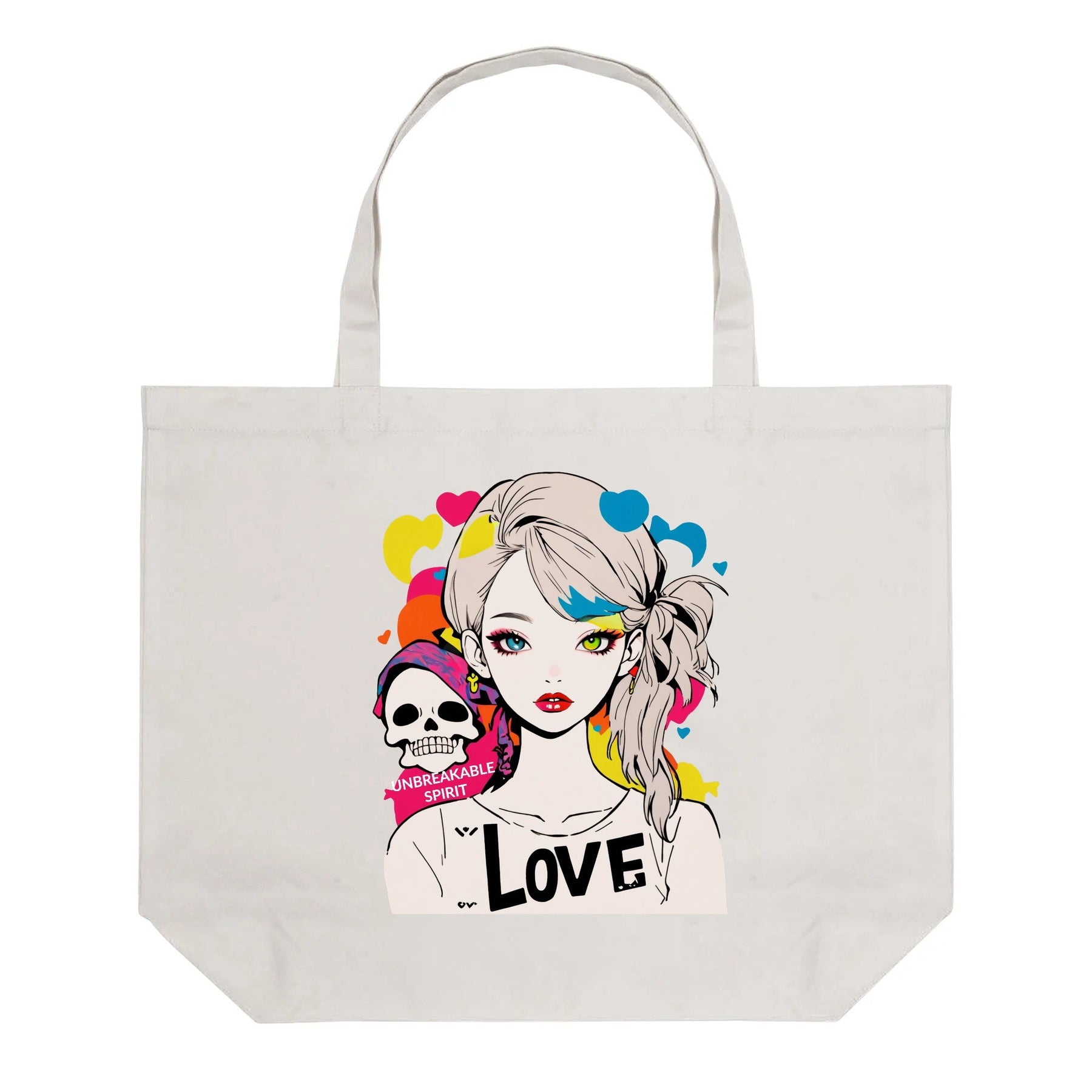 LOVE GIRLのポップアートが映える、クリーンホワイトの100%コットントート。やわらかな手ざわりと環境にやさしい素材、しっかりした縫製で“毎日使い”にちょうどいい一枚です。書類やブック、デイリーの荷物をザクッと入れて、街へ・学校へ・通勤へ。コーデの主役にもなるアートバッグ。